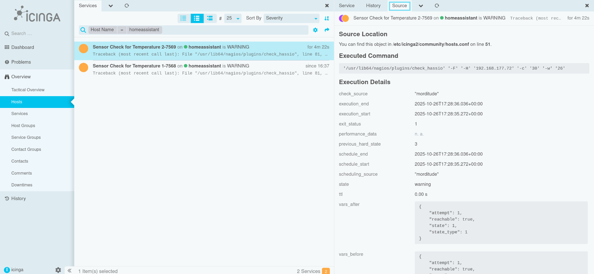 I’m trying to use check_hassio (GitHub - check-plugins/check_hassio: Home Assistant sensor plugin for Nagios/Icinga ) to monitor some temperature sensors, these are Zigbee sensors controlled by Home Assistant. I want to have a Home Assistant host in Icinga which has multiple sensor checks, there will be other Home Assistant hosts in the future, for now there’s just one.