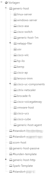 To give you some idea how you could layout your hosts and service templates, I’ll share a screenshot of (a part of) my trees. Don’t consider them the go to way, they are possibly far from perfect and just what I am used to.