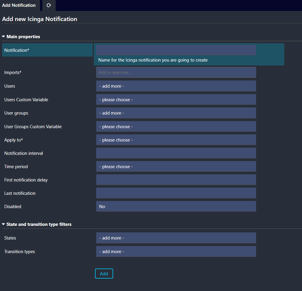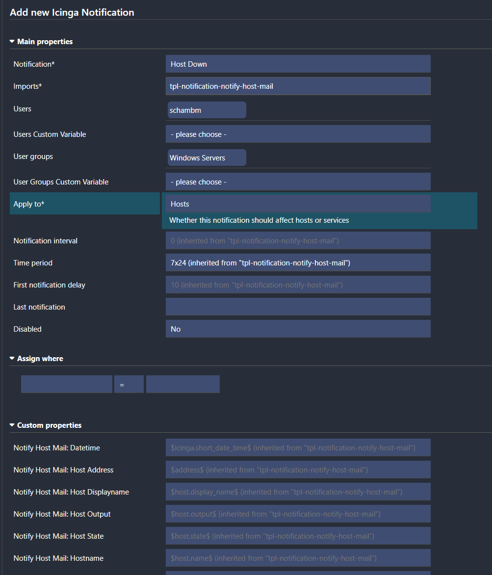 I can set up some of the pulldowns easy enough, but how do I set up say, a notification for any host that goes offline to send me a notification via email (which will also inlcude SMS via email, so two emails).