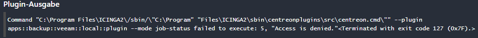 Command "C:\Program Files\ICINGA2\/sbin/\"C:\Program" "Files\ICINGA2\sbin\centreonplugins\src\centreon.cmd\"" --plugin apps::backup::veeam::local::plugin --mode list-jobs failed to execute: 5, "Access is denied."<Terminated with exit code 127 (0x7F).>