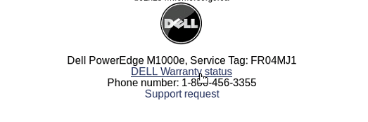 notes = “‘Dell PowerEdge M1000e, Service Tag: FR04MJ1’ ‘DELL Warranty status Phone number: 1-800-456-3355’”