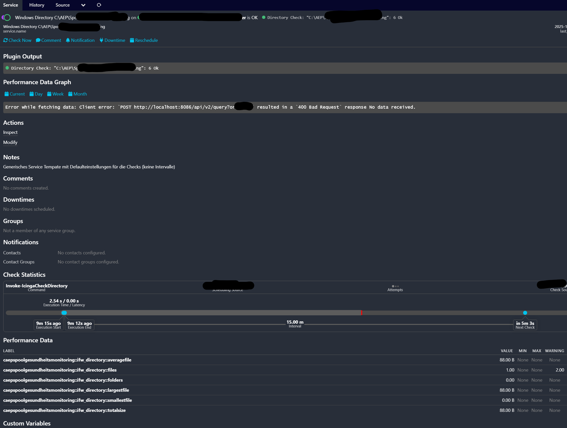2025-11-28T15:51:29+01:00 - DEBUG - Calling query API at ``http://localhost:8086/api/v2/query`` with count query: {“stream”:true,“headers”:{“Authorization”:“Token ”,“Content-Type”:“application/json”,“Accept”:“application/csv”},“query”:{“org”:“”},“json”:{“query”:“from(bucket: "icinga/default")|> range(start: 1764298289)|> filter(fn: (r) => r._measurement == "Invoke-IcingaCheckDirectory")|> filter(fn: (r) => r["hostname"] == "example.local")|> filter(fn: (r) => r["service"] == "Windows Directory C:\AEP\Spool\test")|> count()”,“type”:“flux”,“dialect”:{“header”:true,“delimiter”:“,”,“annotations”:[“datatype”,“group”,“default”],“commentPrefix”:“#”}}}