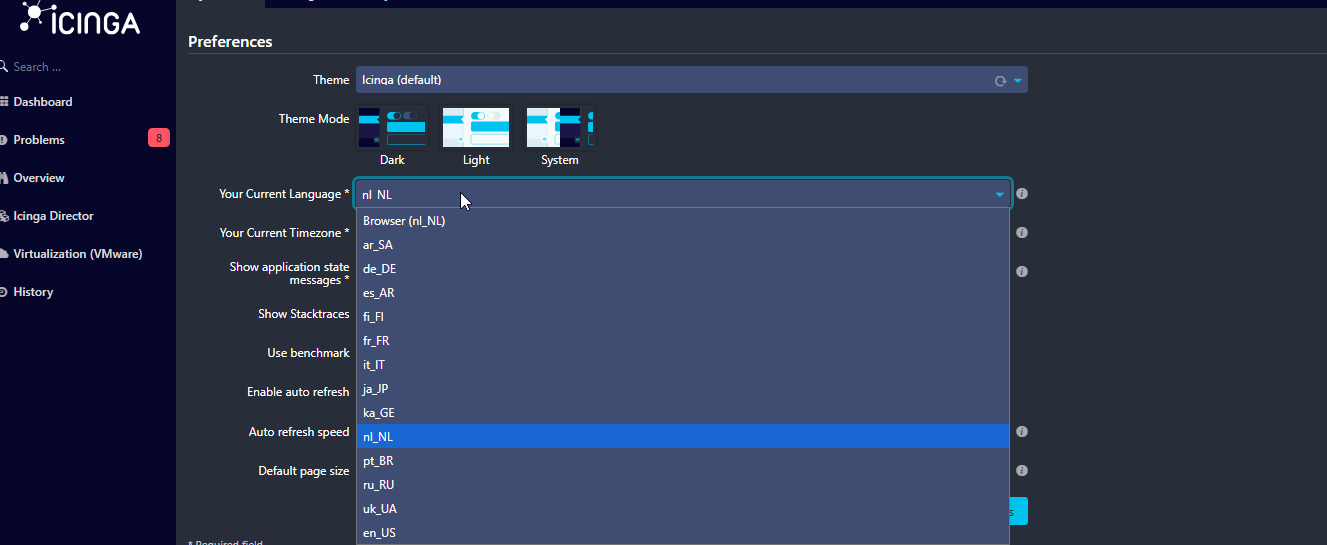I am trying to use another language for webinterface. i have installed module translation and got package from L10n/locale/nl_NL/LC_MESSAGES at main · Icinga/L10n · GitHub. After restarting apache2 i have chose differents languages but the page is not translating,